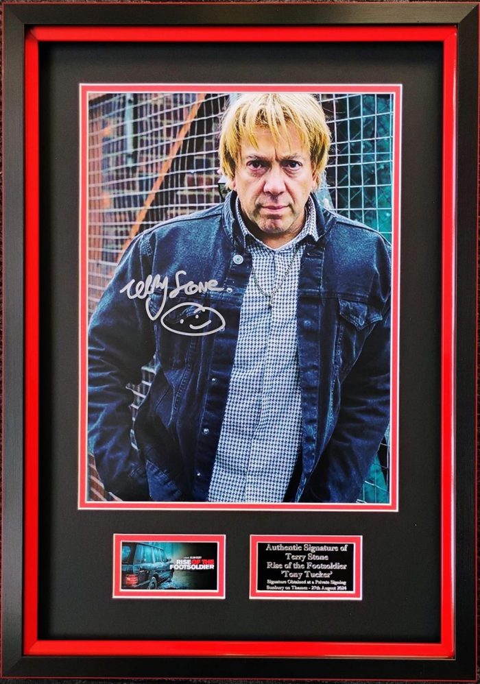 Step into the gritty underworld of the UK’s most infamous criminal saga with this authentic hand-signed tribute to one of British cinema’s most notorious characters – Tony Tucker, portrayed by Terry Stone.